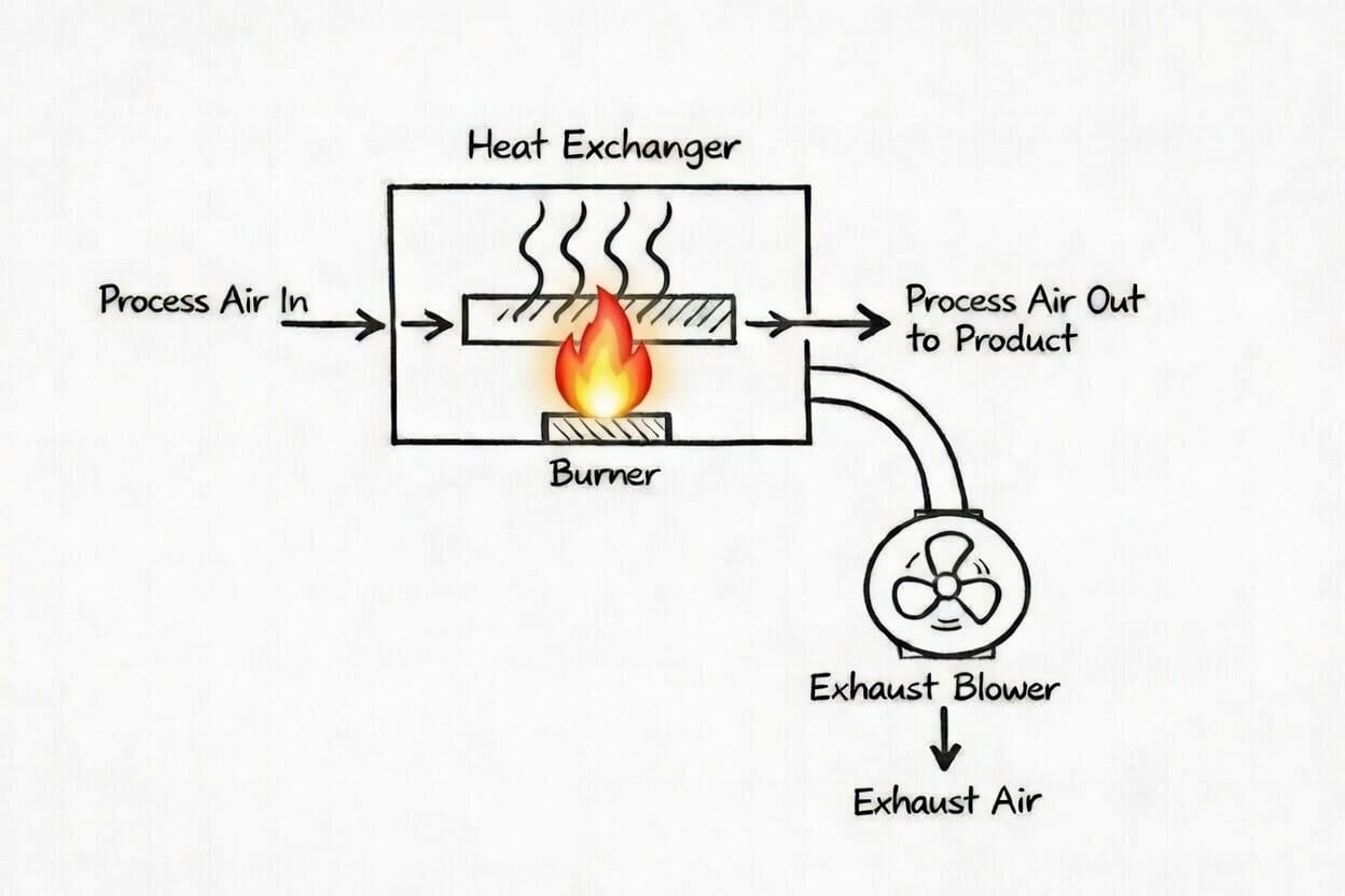- Indirect-fired air heaters use a heat exchanger to separate combustion gases from the process air, delivering contaminant-free heated air. Efficiency is slightly lower, but they excel in food, pharmaceutical, dairy, chemical, or enclosed applications. Our indirect models include recirculating (including USDA-compliant versions), non-recirculating, and straight-through configurations.